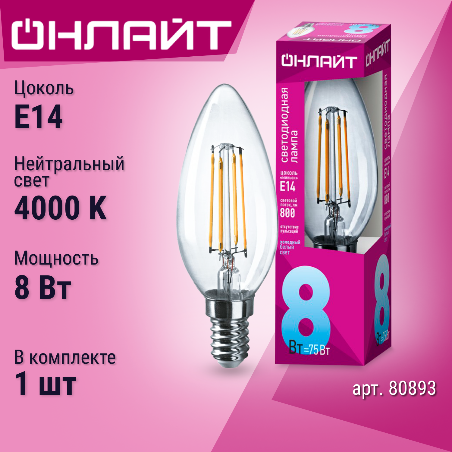 Лампа светодиодная E14 онлайт Свеча, 8Вт, 4000К, лампочка 1 шт. 80893 информация: