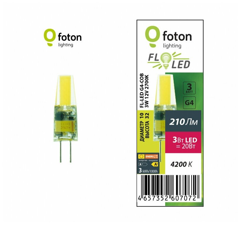 FL-LED G4-COB 3W 12V 4200К G4 210lm 10*32mm FOTON LIGHTING - лампа светодиодная холодный белый информация: