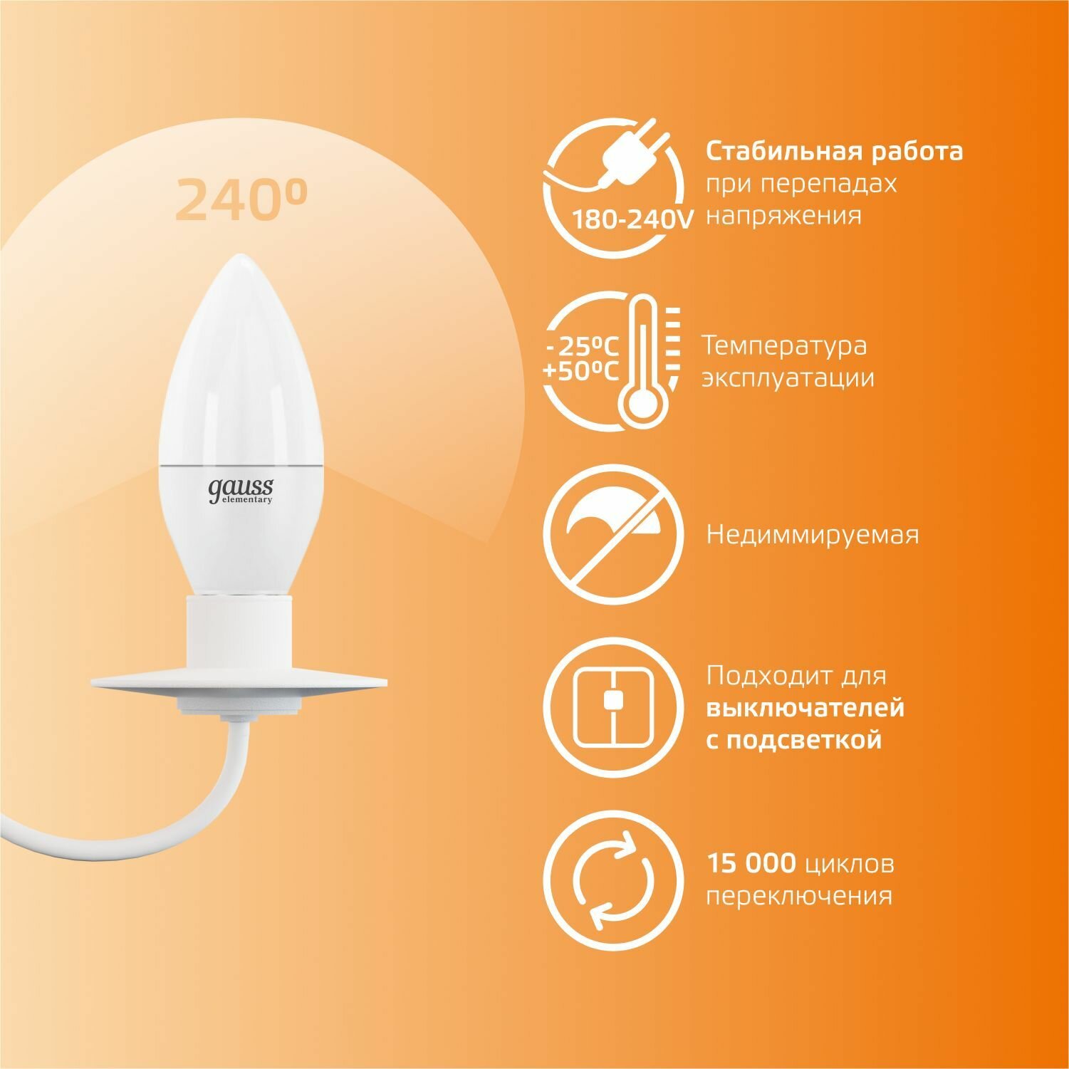 Лампочка светодиодная E14 Свеча 6W теплый свет 3000К упаковка 10 шт. Gauss Elementary информация: