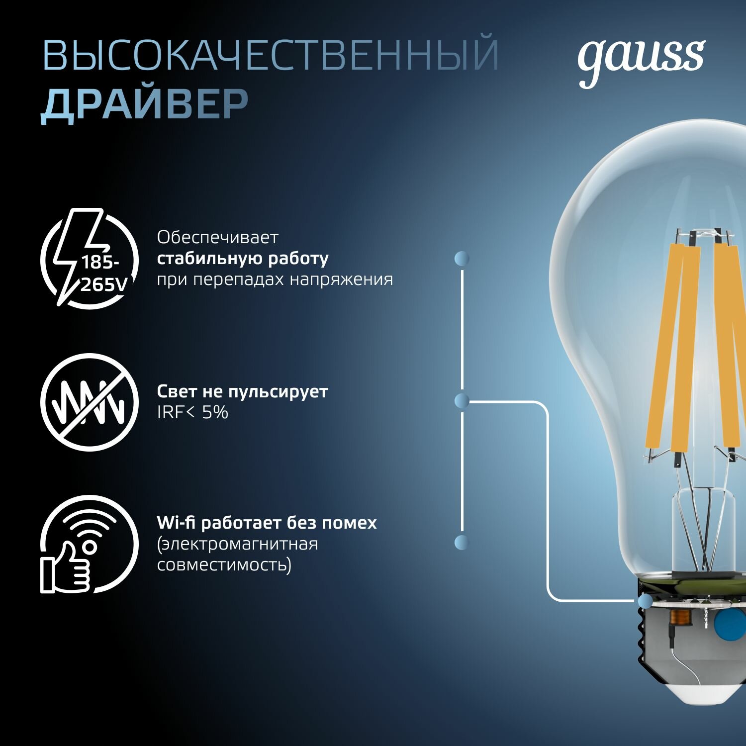 Умная Wi-Fi лампочка Gauss Smart Home А60 8,5W 806лм E27, управление голосом/смартфоном, диммируемая