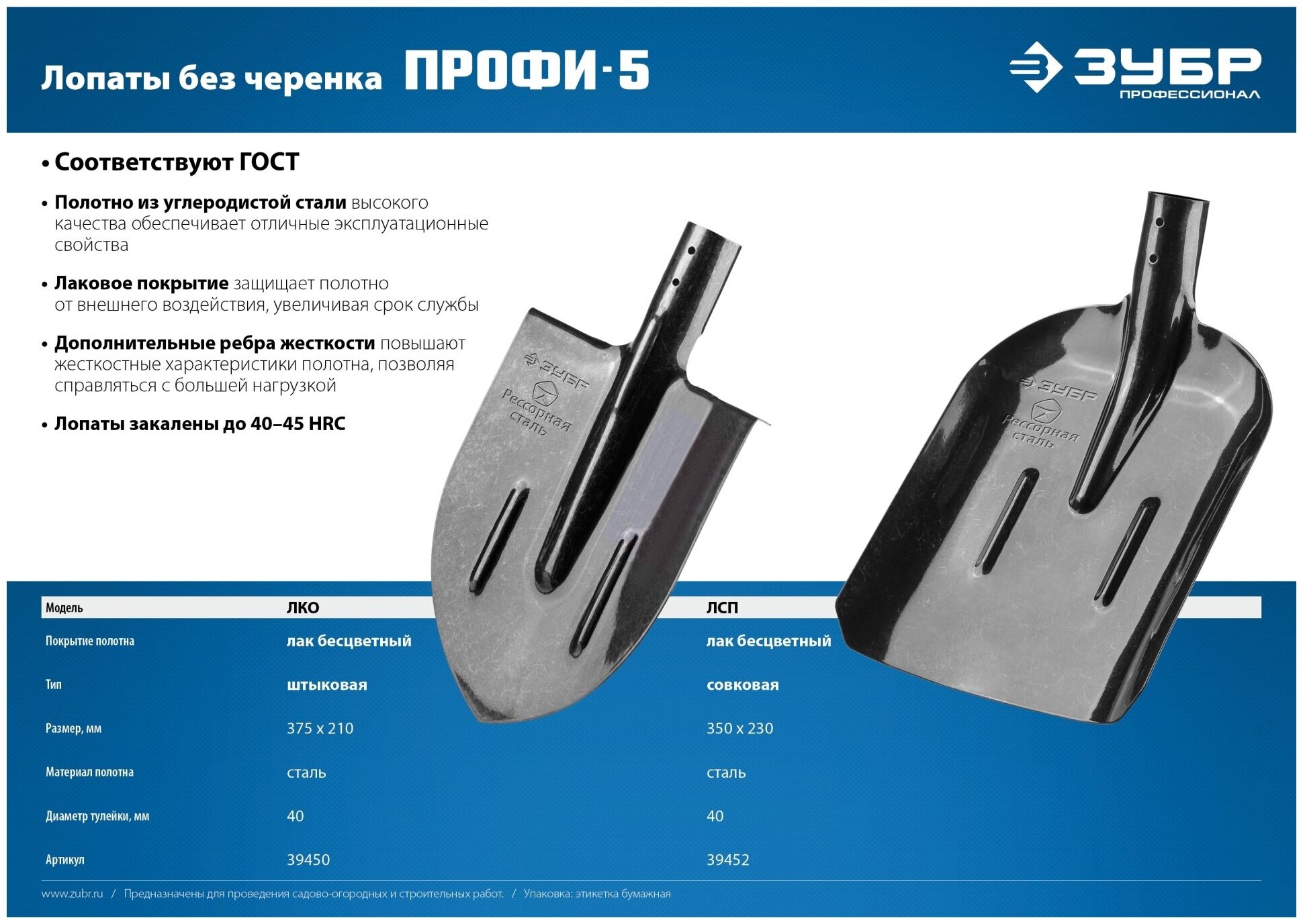 Лопата ЗУБР ПРОФИ-5, 350 х 230 мм, полотно рессорная сталь 1.6 мм закалено, с ребрами жесткости, без черенка, тип ЛСП, совковая лопата, Профессионал (39452)