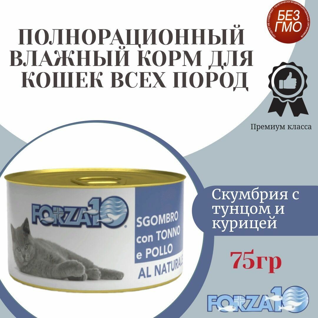 Влажный корм для взрослых кошек FORZA10 SGOMBRO con TONNO e POLLO AL Naturale скумбрия с тунцом и курицей 75г