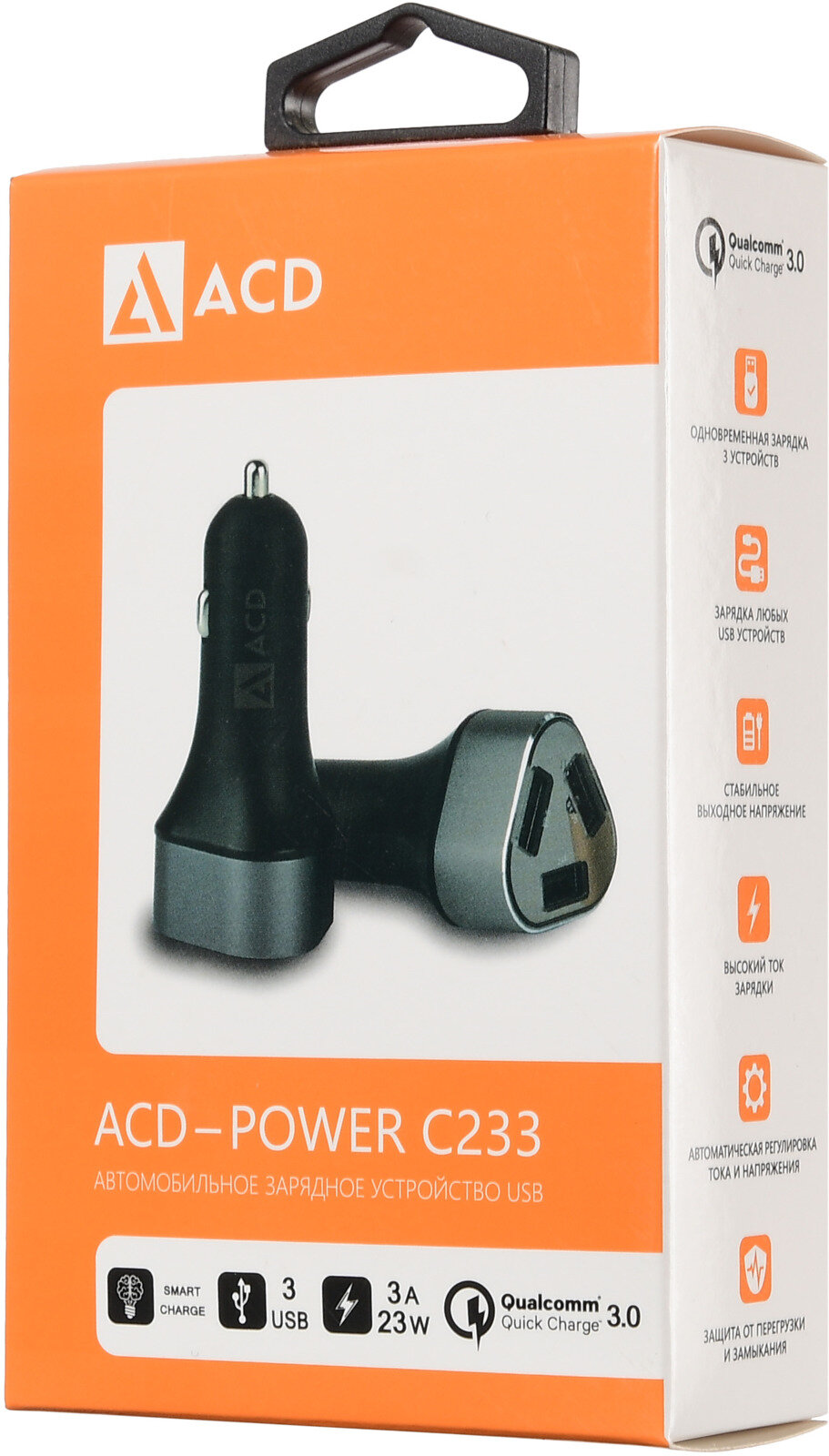 ACD Зарядное устройство автомобильное ACD C233 ACD-C233-X3B, 2xUSB 2.4А, 1xUSB QC3.0 (23Вт) черный (ret)
