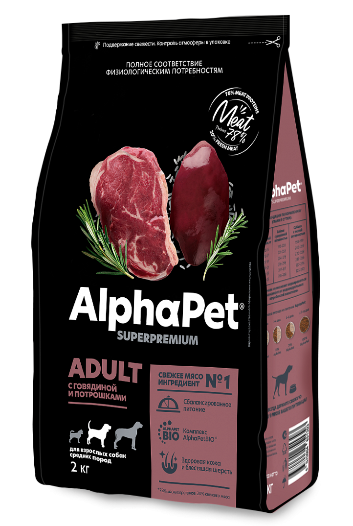 AlphaPet Superpremium сухой полнорационный корм для взрослых собак средних пород с говядиной и потрошками - 2 кг информация: