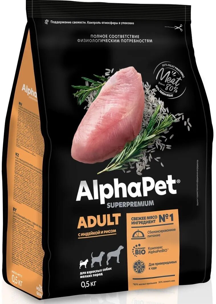 AlphaPet Superpremium сухой полнорационный корм для взрослых собак мелких пород с индейкой и рисом - 500 г 585 ₽