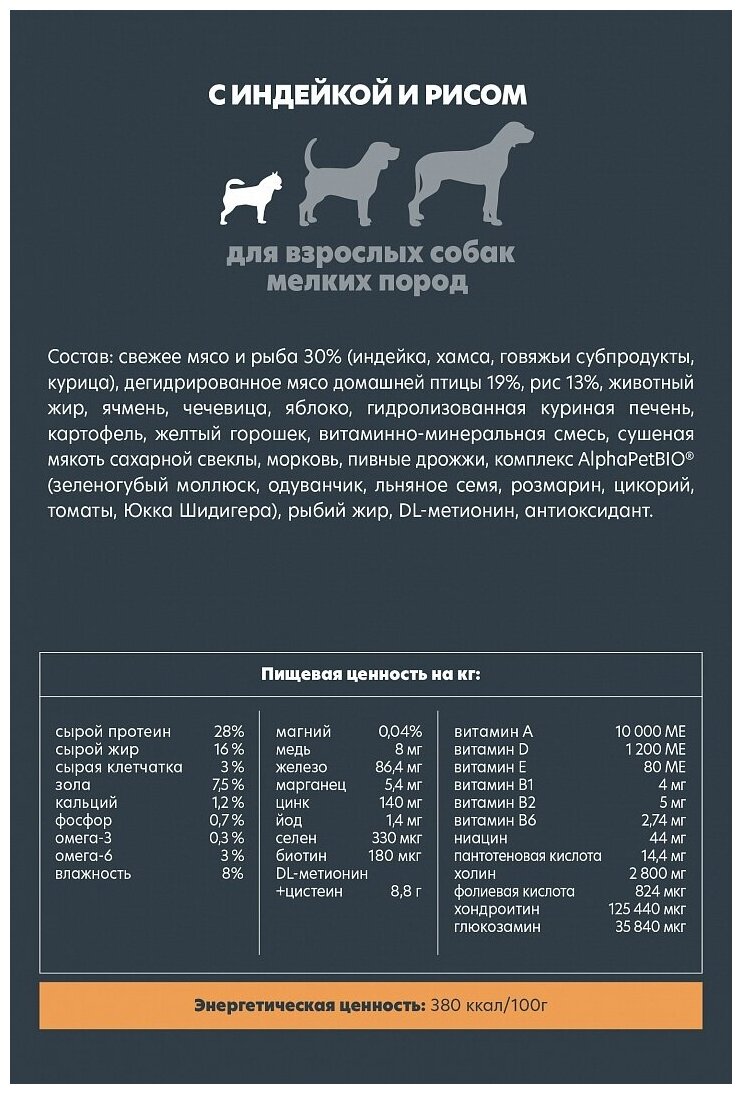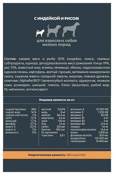 ALPHAPET SUPERPREMIUM Сухой корм для взрослых собак мелких пород с Индейкой и Рисом 3 049 ₽