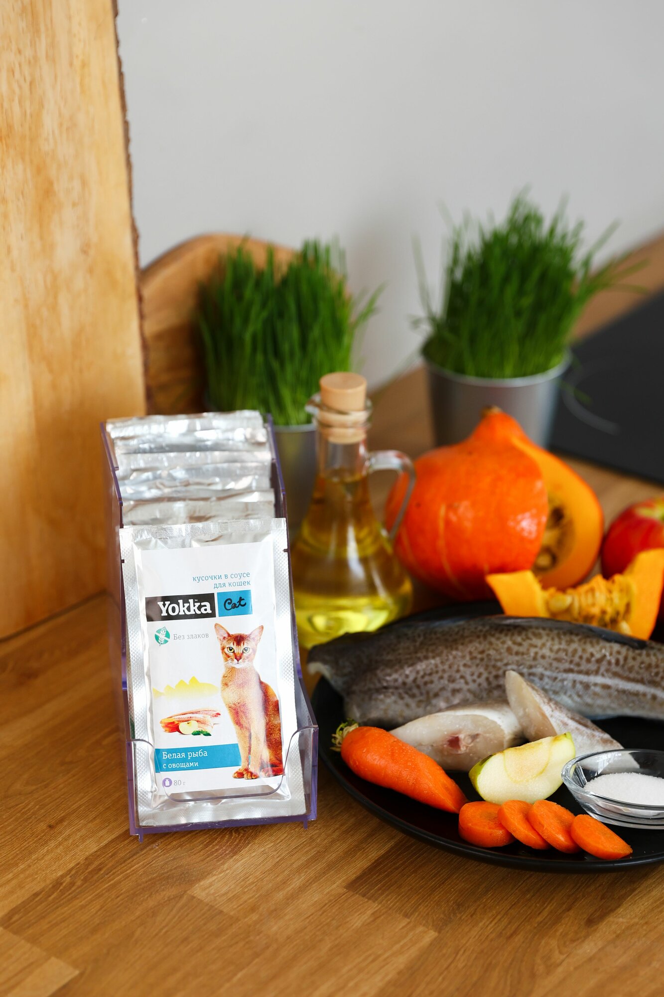 Отзывы на Yokka Cat Натуральный беззерновой консервированный корм для кошек из рыбы с овощами, кусочки в соусе, 80г (12 шт/уп)