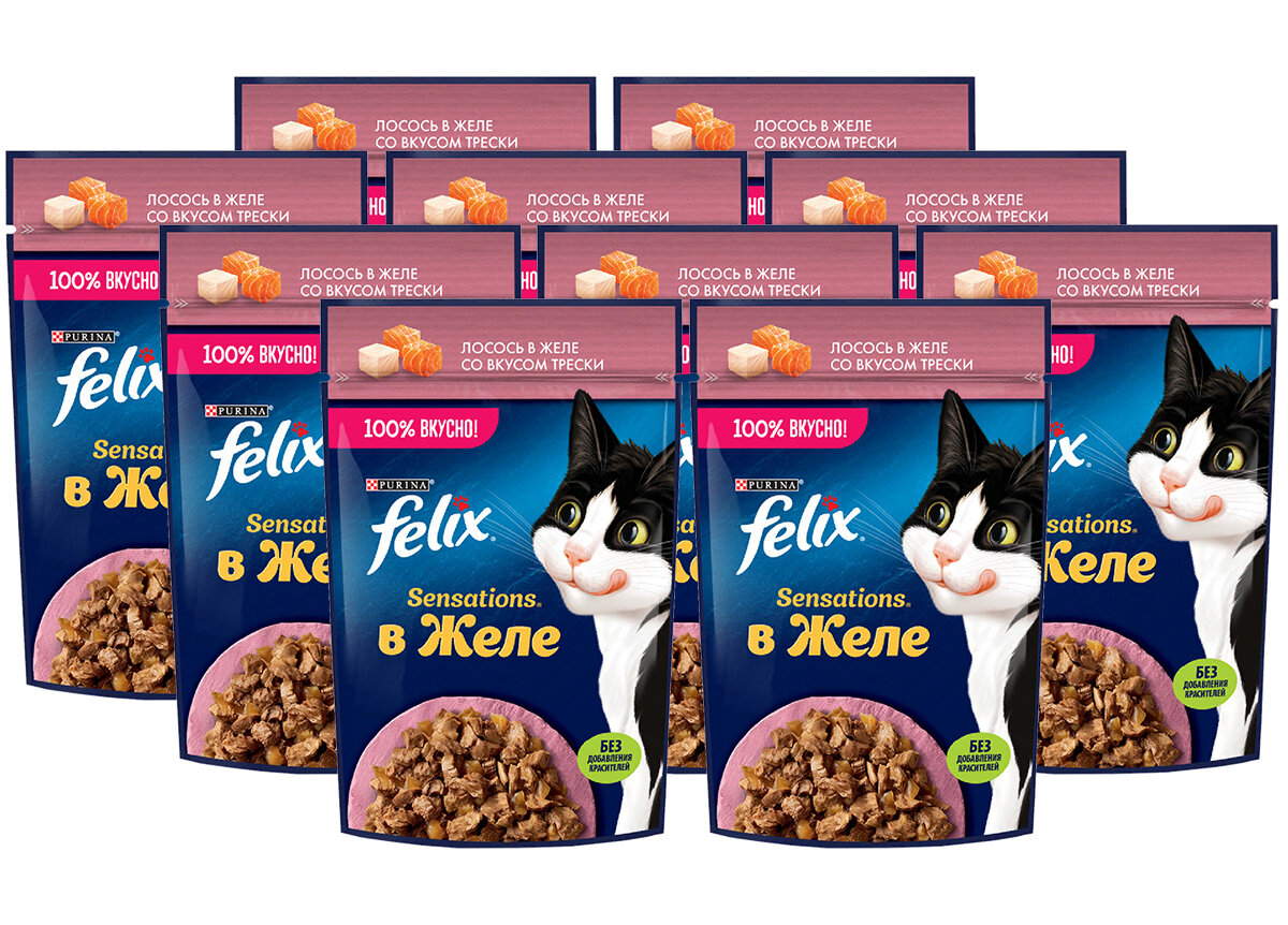 10 цен на FELIX SENSATIONS для взрослых кошек с лососем в желе со вкусом трески пауч 75 гр х 10 шт