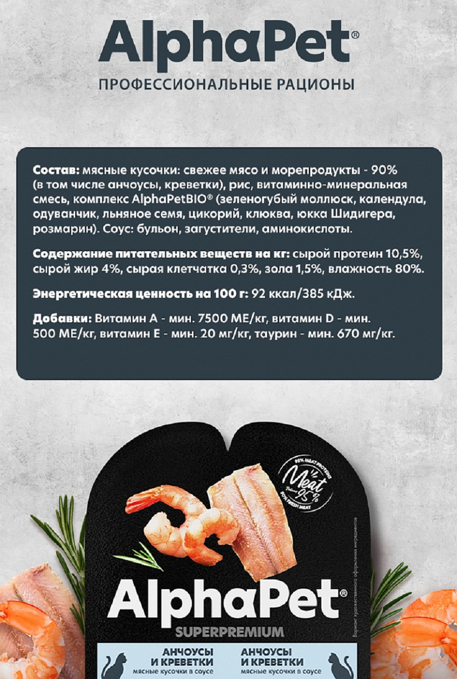 AlphaPet Superpremium пауч для взрослых стерилизованных кошек мясные кусочки в соусе Анчоусы и креветки 80г (15 штук) информация: