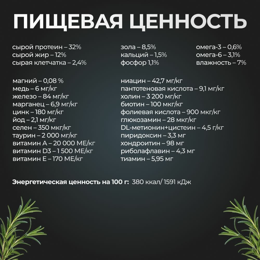 | Пищевая ценность | сырой протеин - 35%, сырой жир - 12%, сырая клетчатка - 2,5%, зола - 8%, кальций - 1%, фосфор - 0,7%, омега 3 - 0,9%, омега 6 - 3%, влажность - 8% |