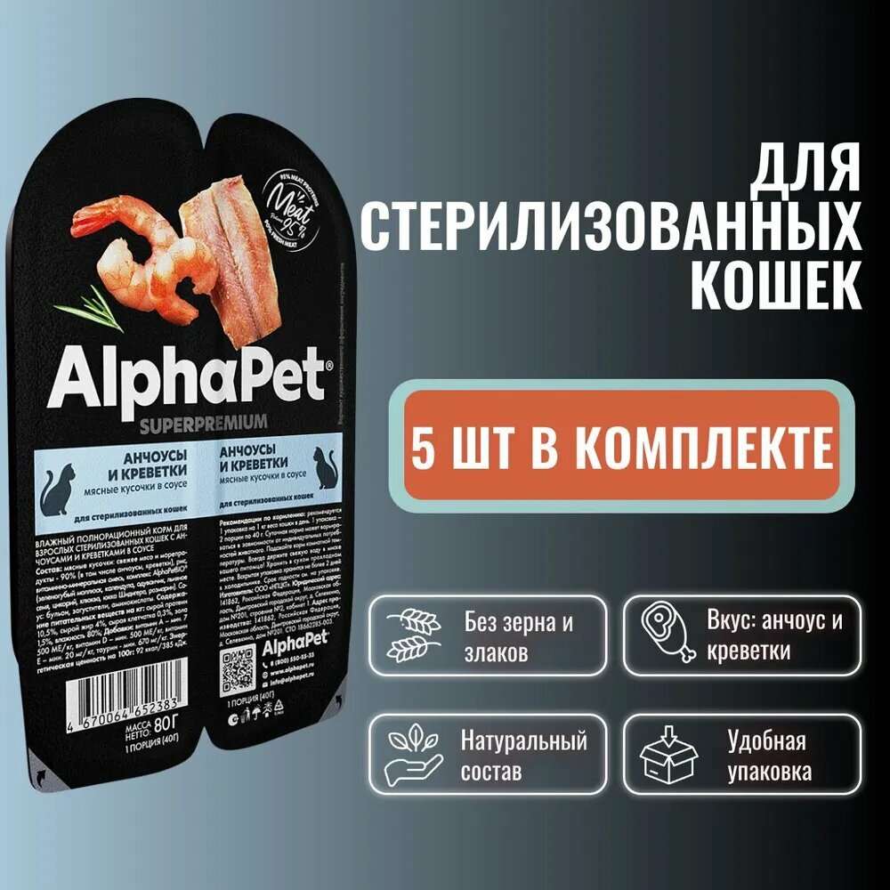 Влажный полнорационный корм холистик для взрослых стерилизованных кошек AlphaPet Superpremium Анчоусы и креветки мясные кусочки в соусе 80 гр х 5 шт информация: