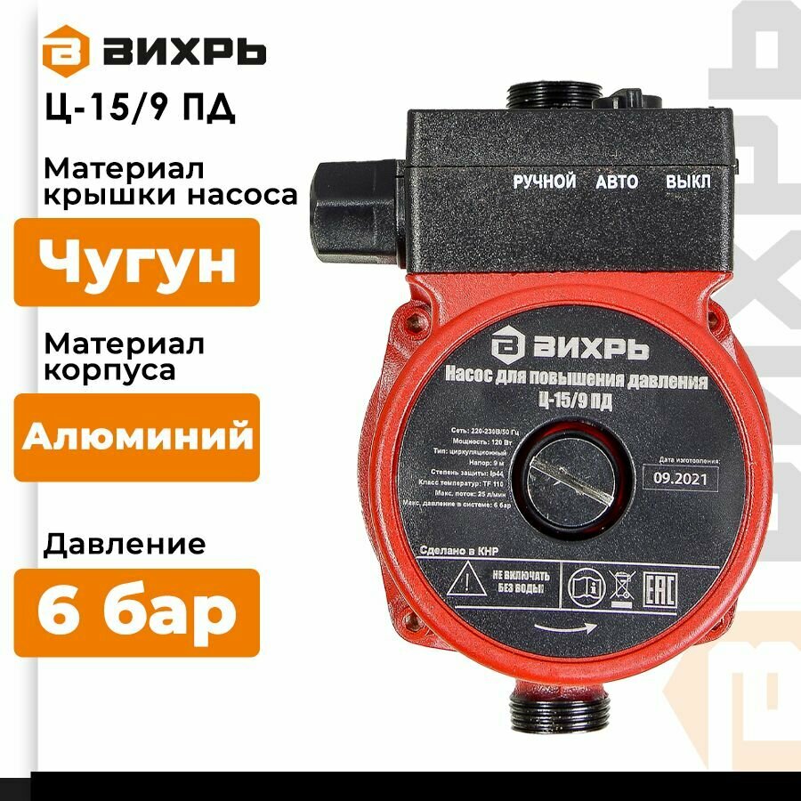 Насос циркуляционный Вихрь Ц-15/9 ПД, для чистой воды, 120Вт, глубина всасывания 8м информация: