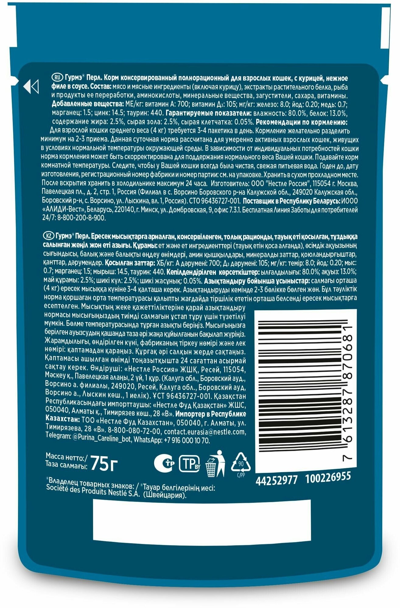 | Состав | обновленный: мясо и мясные ингредиенты (включая курицу), экстракты растительного белка, рыба и продукты ее переработки, аминокислоты, минеральные вещества, загустители, сахара, витамины. прежний: мясо и продукты переработки мяса (из которых курица мин. 4%), экстракт растительного белка, рыба и продукты переработки рыбы, минеральные вещества, аминокислоты, загуститель, сахара, красители, витамины |