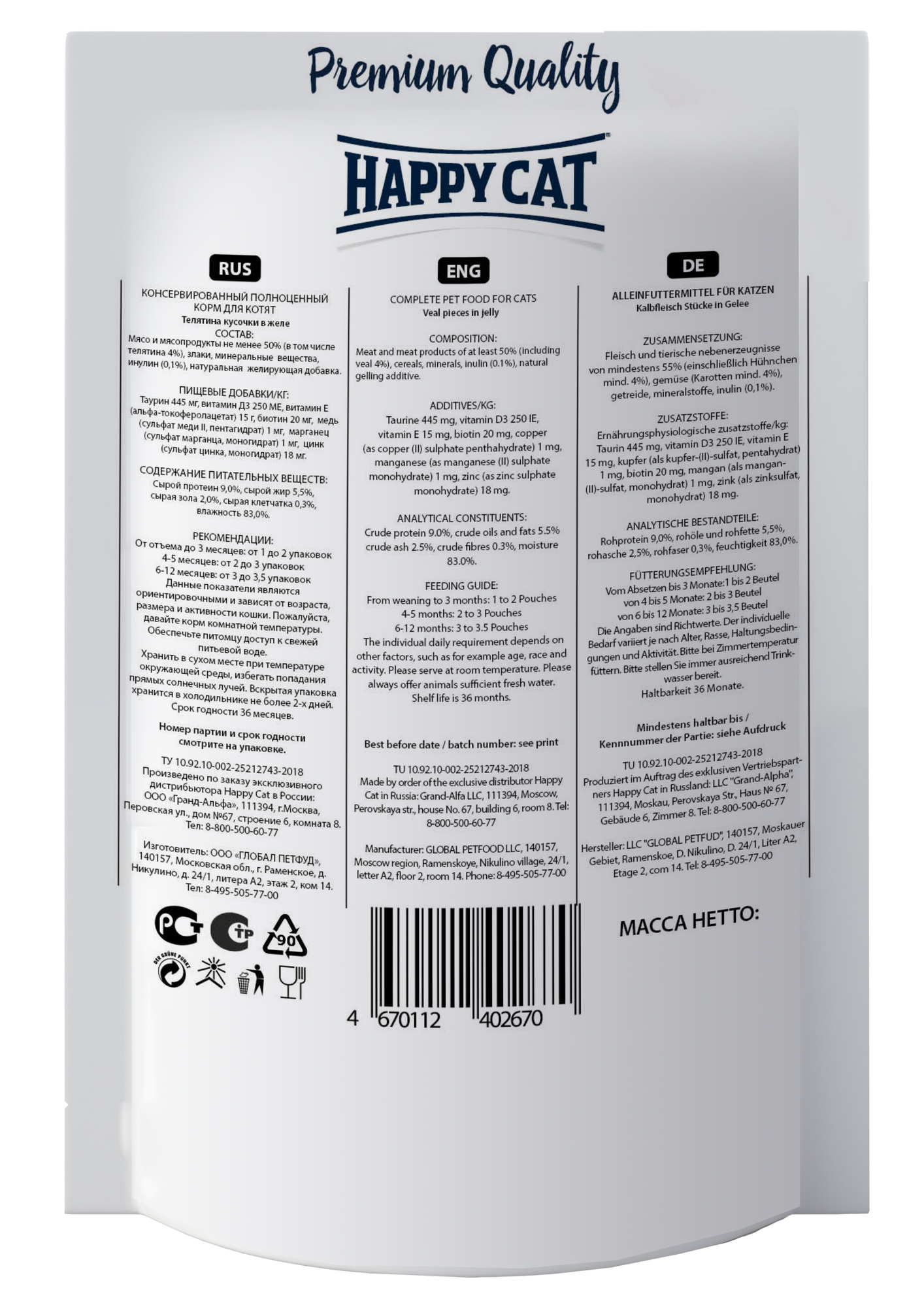Хэппи Кэт пауч для котят кусочки в желе Телятина 85г информация: