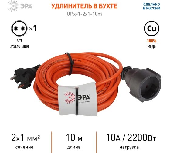 Отзывы на Удлинитель силовой Эра UPx-1-2x1-10m-IP44 (Б0046805) 2x1.0кв.мм 1розет. 10м ПВС 10A без катушки оран