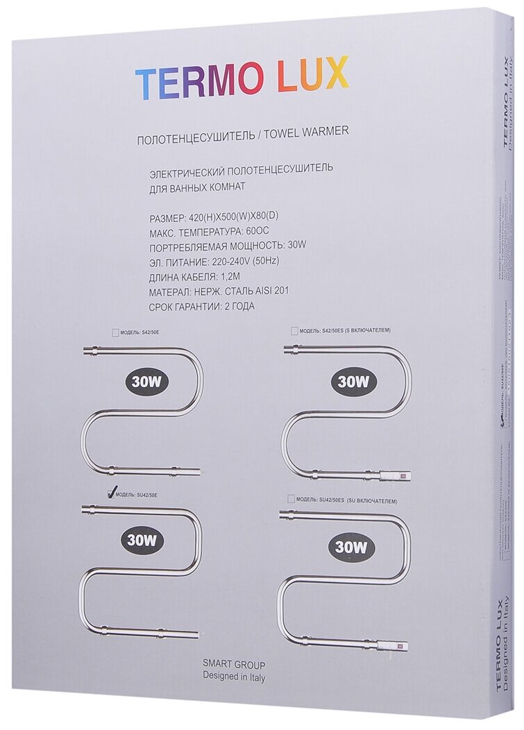 Полотенцесушитель электрический TERMLUX SU42/50E (S-образный, 420х500х85, 30 Вт, подключение универсальное) информация:
