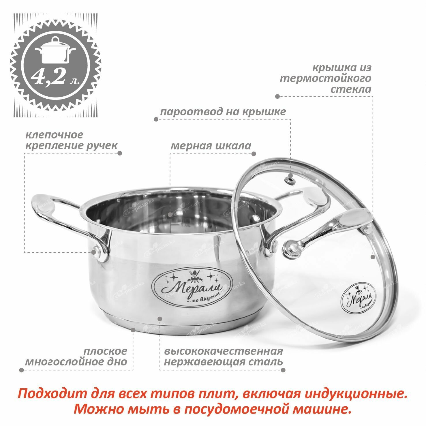 Кастрюля с крышкой 4,2 л из нержавеющей стали для всех видов плит, включая индукционную информация: