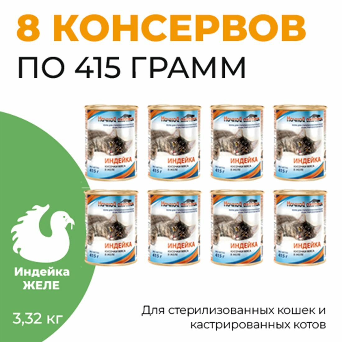 Консервы для кошек ночной охотник 8 шт по 415г Индейка для стерилизованных кошек и кастрированных котов в желе