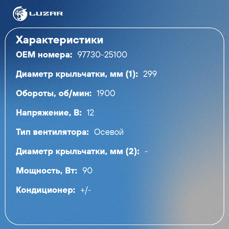 | Дополнительная информация | кондиционер: +/-; трансмиссия: M/A; напряжение, В: 12; мощность, Вт: 90; диаметр крыльчатки, мм: 299; обороты, об/мин: 1900; сила тока, А: 7.5; тип вентилятора: осевой |