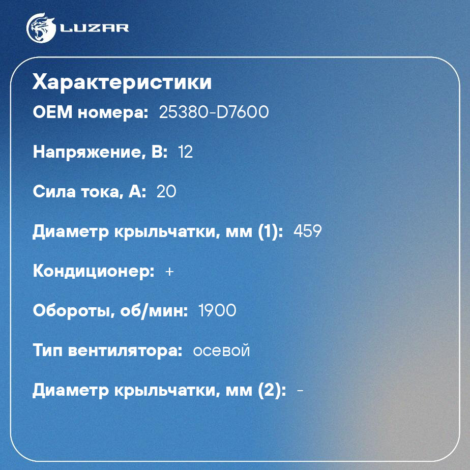 Отзывы на Электровентилятор охлаждения для автомобилей Hyundai Tucson (15-)/Sportage (16-) 2.0i/2.4i (с кожухом и резистором) LFK 0876 LUZAR