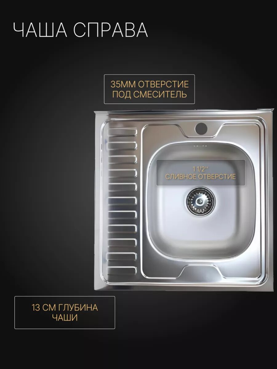 Мойка для кухни накладная, нержавеющая сталь, 60x60 правая информация: