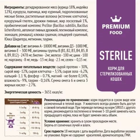 Корм для стерилизованных кошек сухой SIRIUS с индейкой и курицей, 1,5кг информация: