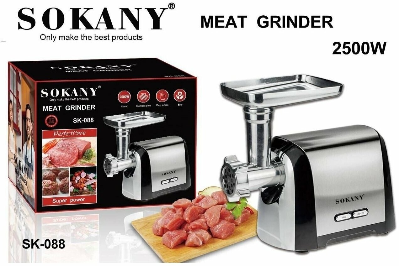 Мощная кухонная мясорубка /SK-088/2500 Вт/сменные режущие пластины 3 шт./лезвие из пищевой нержавеющей стали/серебристый информация: