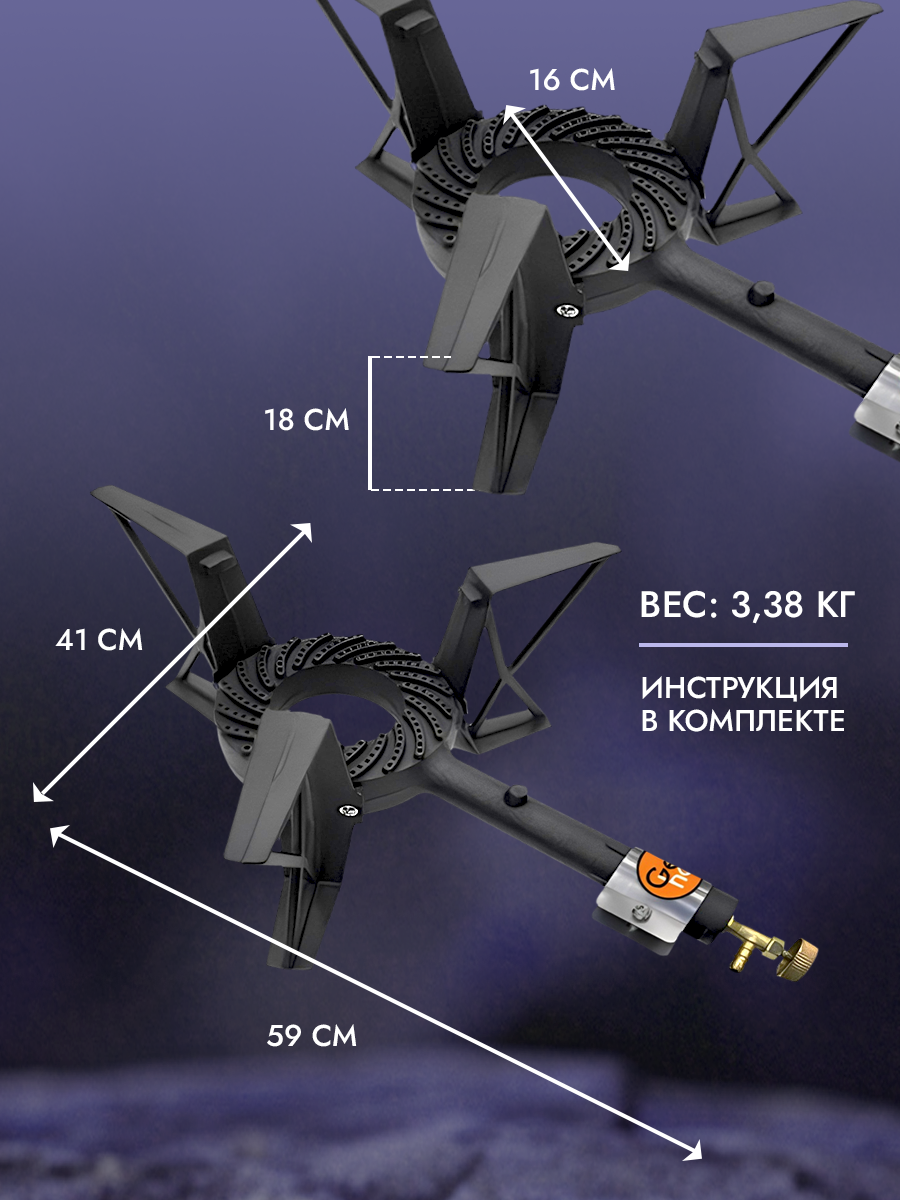 | Дополнительная информация | Подходит только под баллонный газ. Назначение Вок / Казан / Дистиллятор / Коптильня / Сыроварня / Автоклав / Кейтеринг; расход топлива: 650 г/ч |