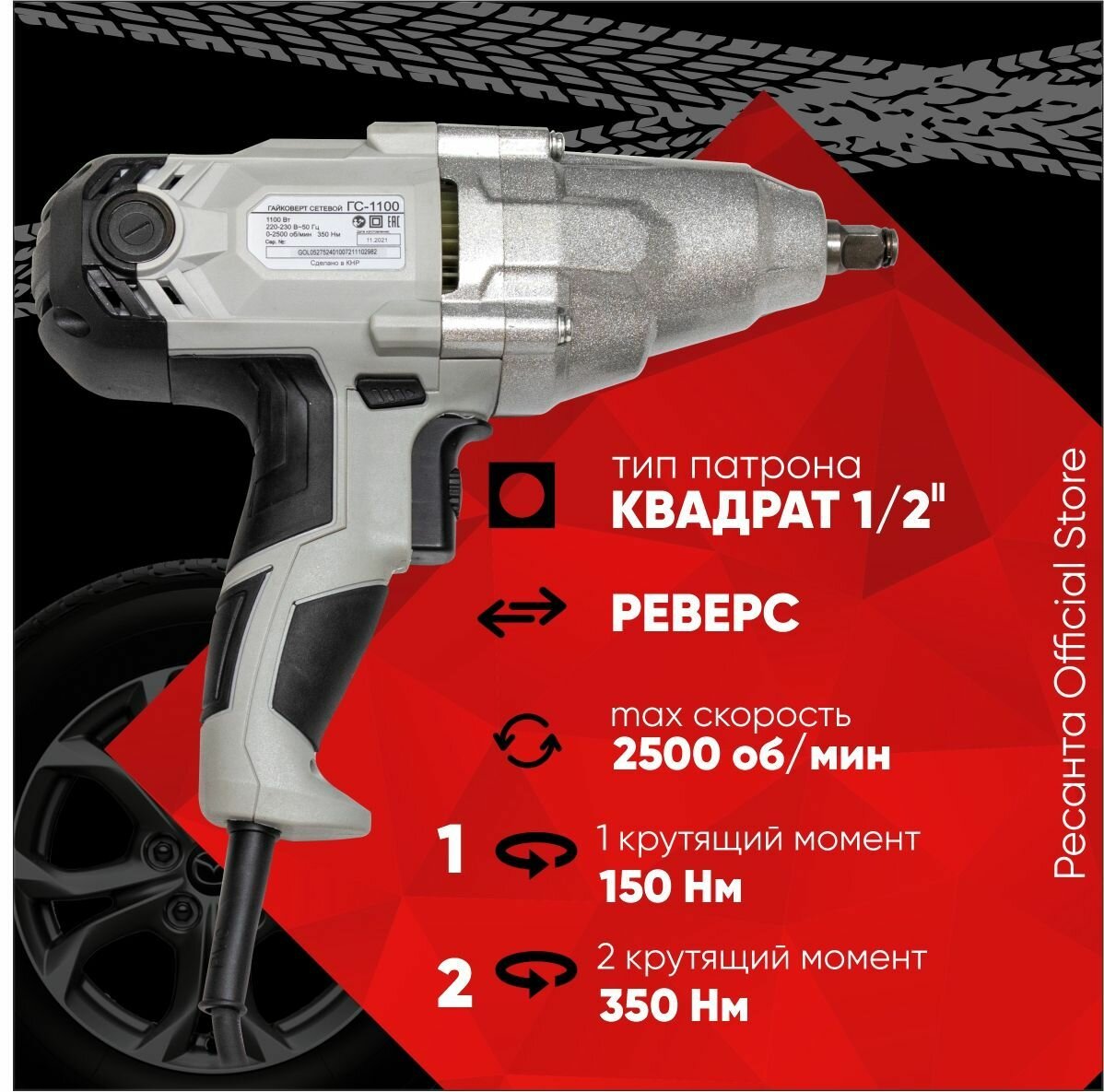 Гайковерт сетевой ГС-350 PRO Ресанта - 1100 Вт, 350 Н*м, 2 скорости, гарантия 5 лет, повышенный ресурс / болтоверт для гаек и блотов для шиномонтажа информация: