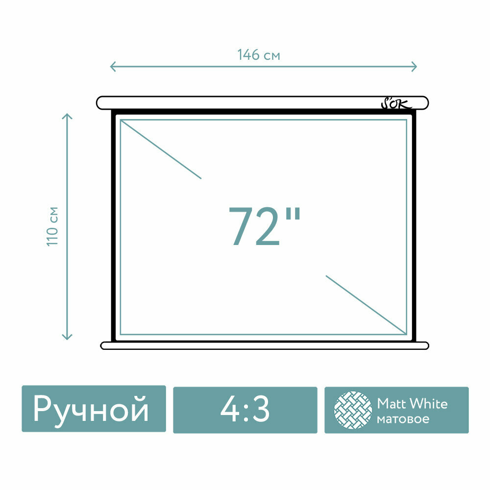 Экран для проектора SOK SCPSW-146x110 72 4:3 настенно-потолочный, ручной, матовый, белый информация: