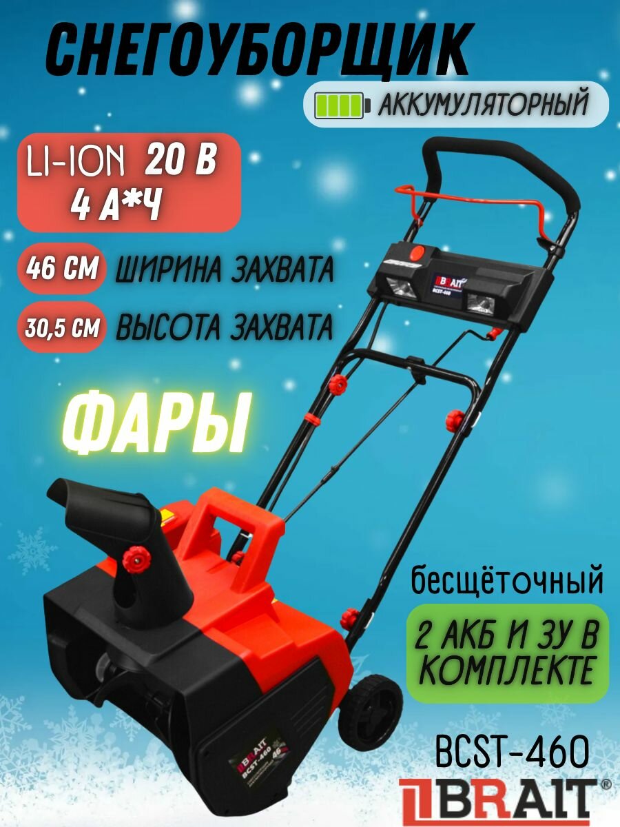 Снегоуборщик аккумуляторный BRAIT BCST-460 (ЗУ и АКБ в комплекте, 4 Ач, 20 В, 800 Вт, 2 фары, ширина захвата 460 мм, высота 305 мм, IPX4) / снегоуборочная машина / техника для уборки территории 30 500 ₽