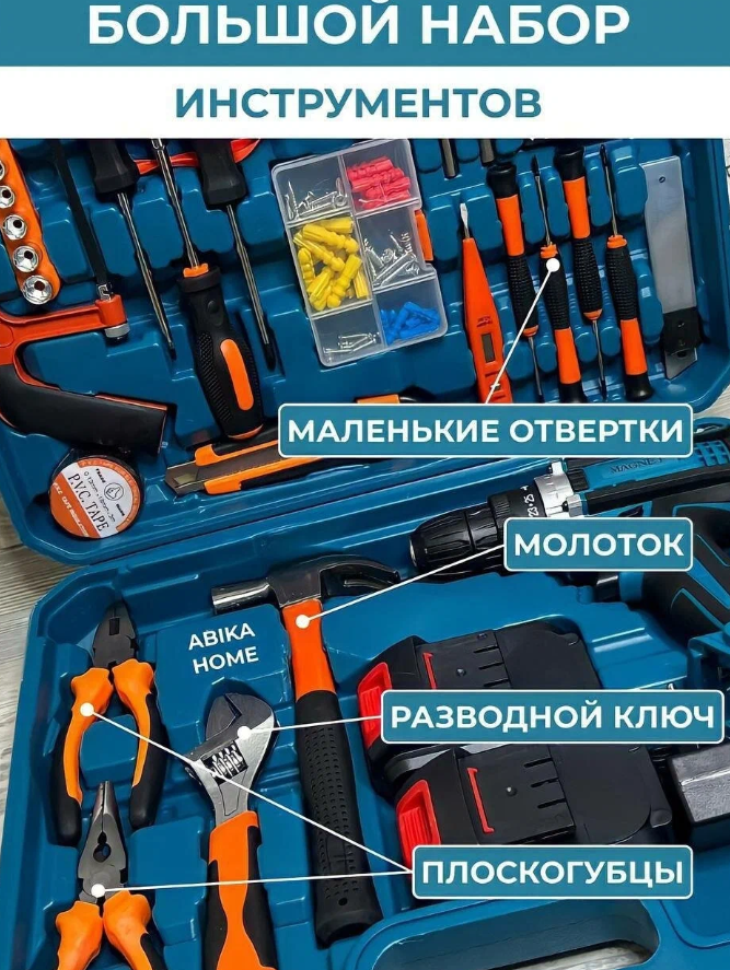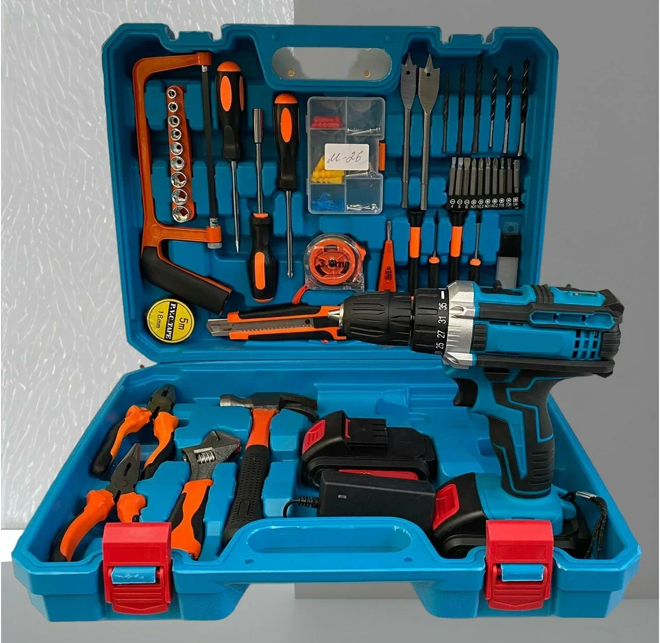 | Подробная комплектация | Шуруповерт 20B-1шт,2 аккумулятора , (Li-Ion),Зарядное устройство 20V-1шт,Биты-10шт,сверла по металлу и дереву -6шт,Молоток-1шт,пласкошубцы-1шт,длинногубцы-1шт,разводной ключ-1шт,Изолента-1шт,Пила-1шт,Торецевые головки-9шт,отвертка для головок-1шт,Отвертка крестообразная-1шт,Отвертка прямой шлиц-1шт,Набор дюбелей и саморезов(по 10шт)-1шт,Рулетка(3м)-1шт,ИНдикаторная отвертка-1шт,Перевые сверла по дереву, Канцелярский нож-1шт,Запасные лезвия-5шт,Отвертки малые-4шт,Ударопрочный кейс-1шт |