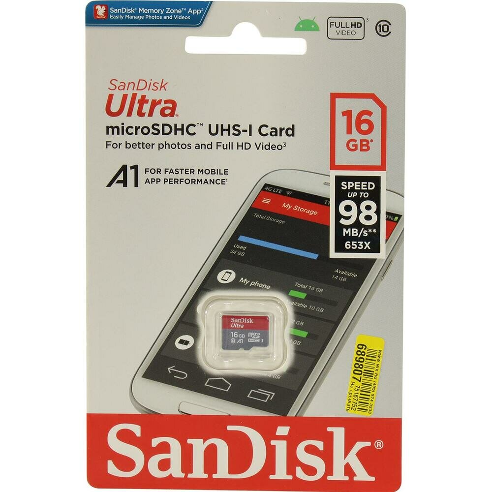 Карта памяти 16Gb MicroSD SanDisk Ultra (SDSQUAR-016G-GN6MN) информация: