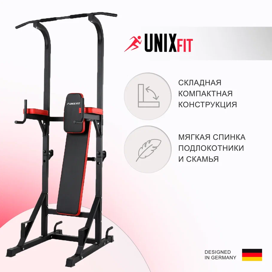 Турник-пресс-брусья со скамьей 3 в 1 UNIX Fit POWER TOWER 120P для домашних тренировок, 2 хвата, нагрузка на скамью до 240 кг., длина перекладины 109 см.,182 x 109 x 222 см. UNIXFIT информация: