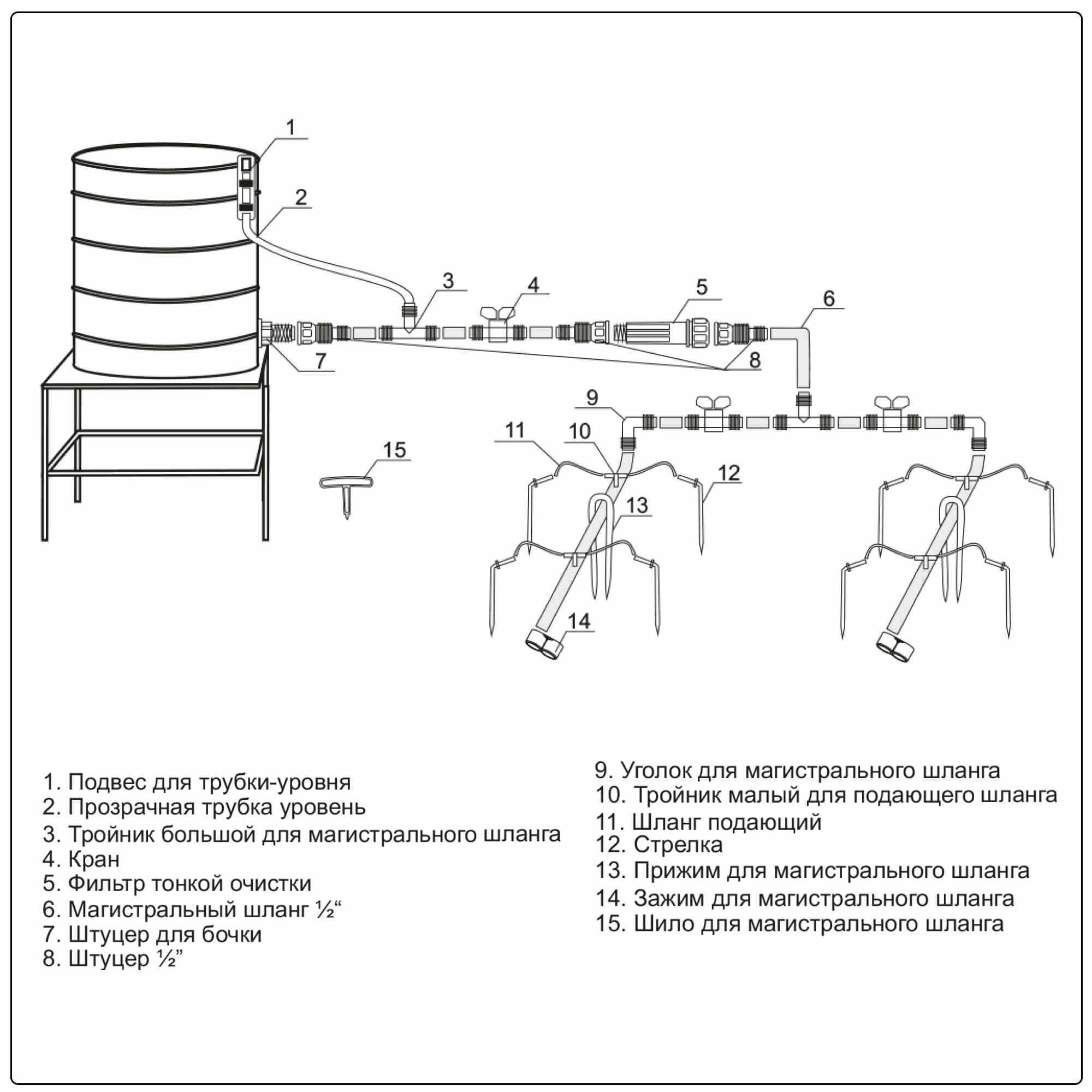 | Комплектация | штуцер присоединения к ёмкости - 1 шт., шланг магистральный 9 м - 1 шт., трубка уровень прозрачная 1 м - 1 шт., подвес для трубки уровня -1 шт., шланг подающий 40 см - 30 шт., капельницы - 30 шт., тройник малый - 15 шт., кран - 1 шт., уголок для магистрального шланга - 2 шт., тройник большой - 2 шт., заглушка для магистрального шланга - 2 шт., прижим для магистрального шланга - 18 шт., шило для магистрального шланга - 1 шт., штуцер 1/2" - 3 шт., фильтр тонкой очистки - 1 шт. |