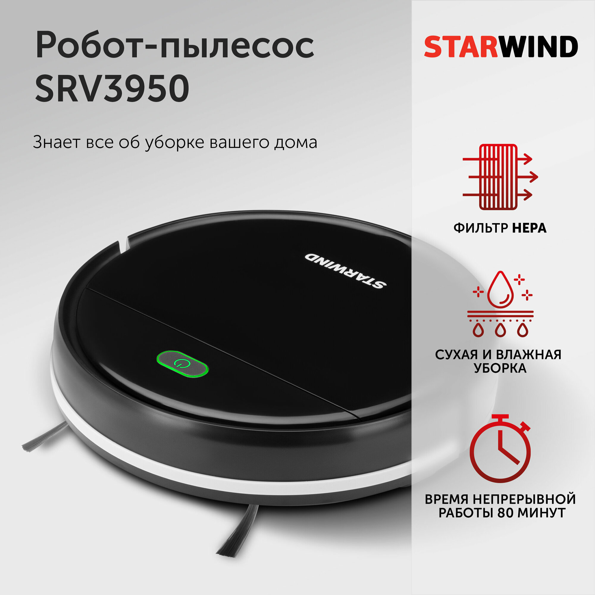 Робот-пылесос Starwind SRV3950, 1500 мАч, 4 режима, черный/черный информация:
