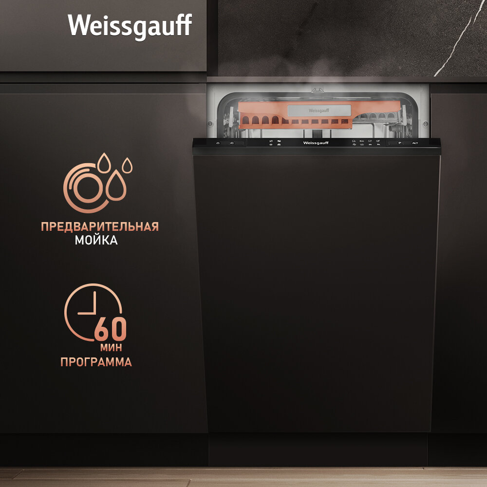 Встраиваемая посудомоечная машина Weissgauff BDW 4535,3 года гарантии, 3 корзины, 11 комплектов, 5 программ, Полная защита от протечек, Половинная загрузка, Предварительная мойка, Дополнительная сушка, Отсрочка запуска 30 440 ₽
