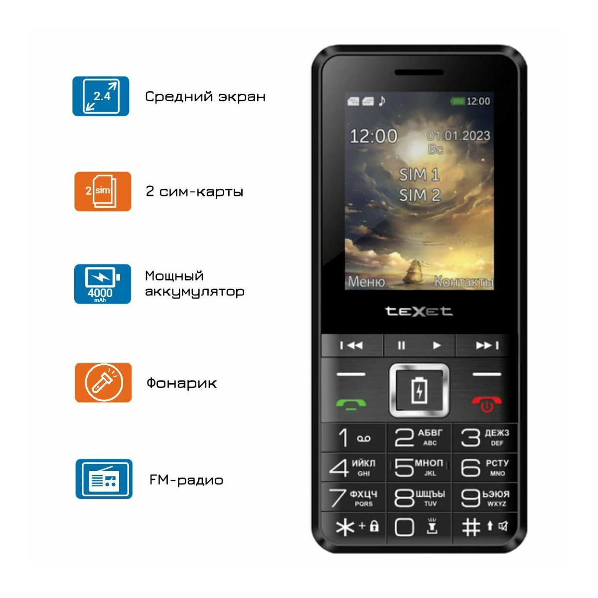 Мобильный телефон кнопочный Texet TM-D215, 4000 mAh, 2SIM, черный информация: