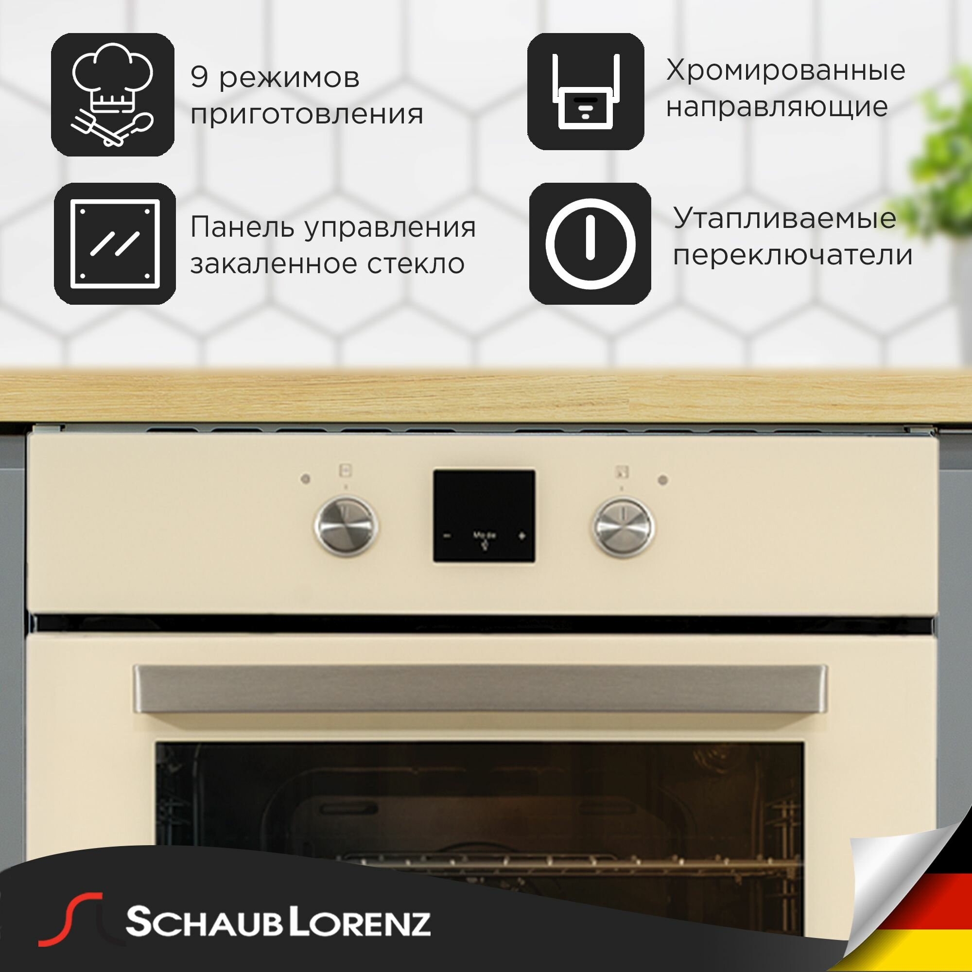 10 цен на Духовой шкаф электрический встраиваемый Schaub Lorenz SLB EI6953, бежевый, гриль, конвекция, 69 л, 9 режимов.