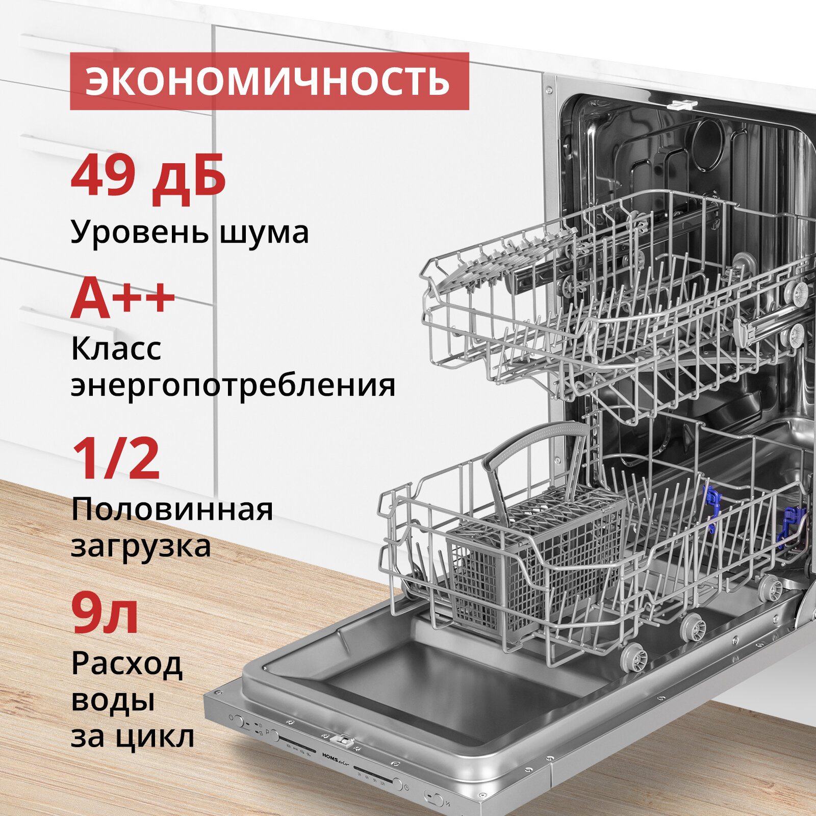 Посудомоечная машина HOMSair DW44L-2 встраиваемая 45 см, 2 корзины, 4 программы, 9 комплектов посуды информация: