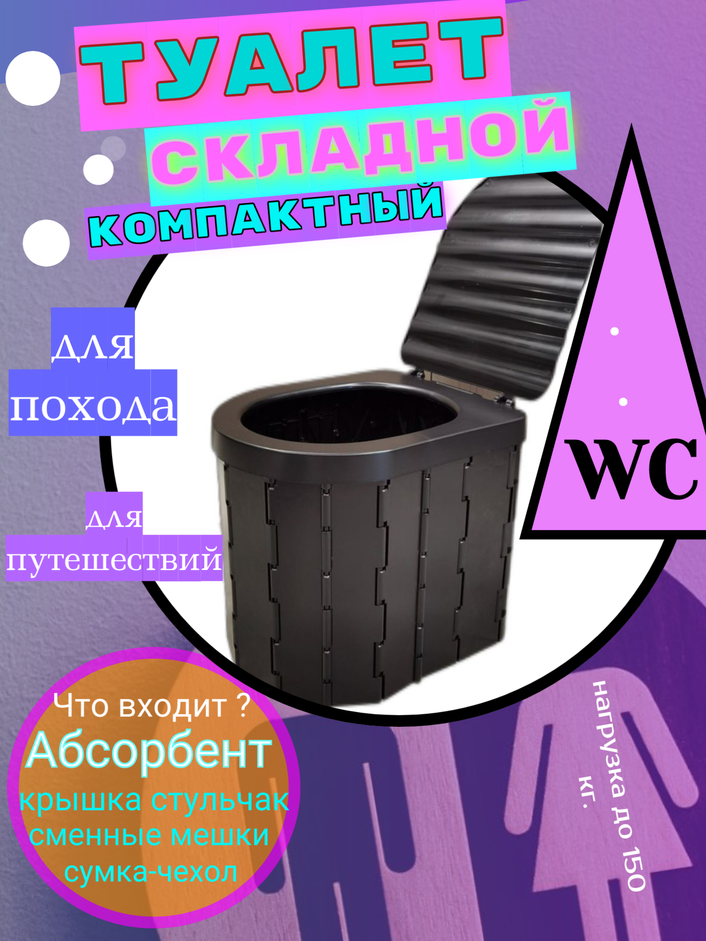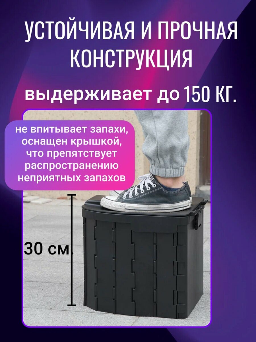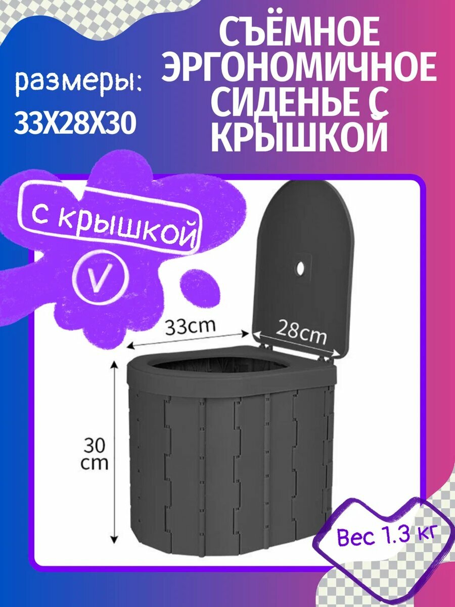 | Подробная комплектация | Складной туалет для путешествий – 1 шт сумка чехол – 1 шт одноразовый мешок-пакет – 12 шт. крышка с сидением - 1 шт. абсарбент - 1 упаковка |