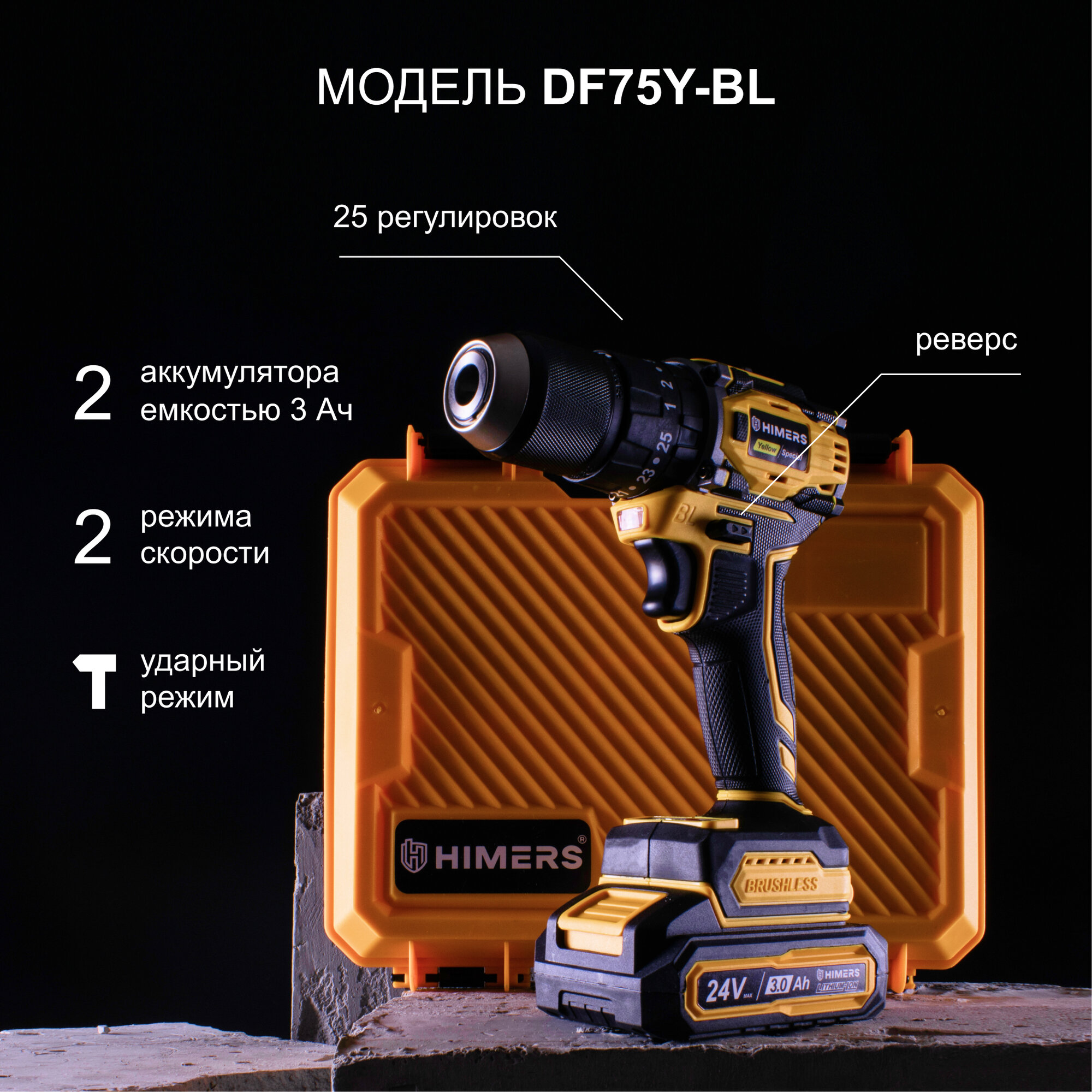10 цен на Бесщеточный шуруповерт HIMERS DF75Y-BL аккумуляторный 24V, 2 АКБ по 3 А.ч, 75 Н.м, 13мм патрон, кейс