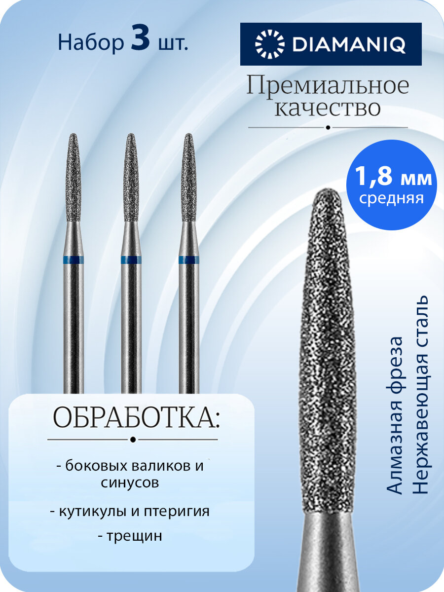 DIAMANIQ Фреза для маникюра и педикюра алмазная 825 244 524 018 Средняя синяя пламя с закругленным кончиком (упаковка 3 шт) d-1.8