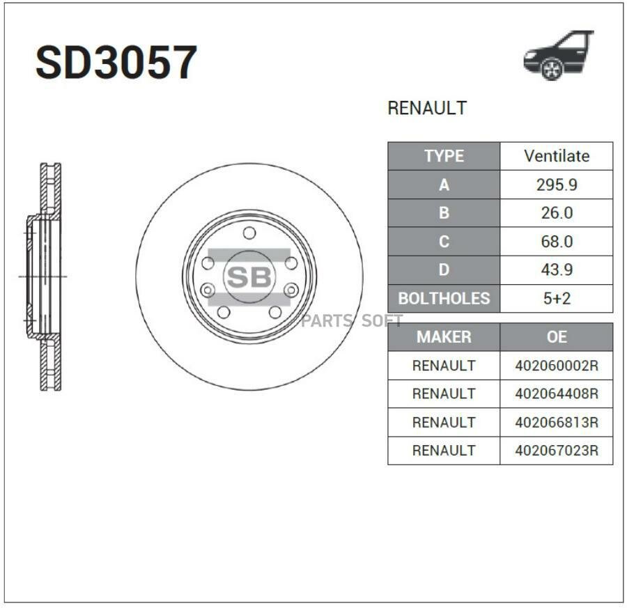 Диск тормозной передний SD3057 для Renault Laguna/Megane/Scenic 1.4-2.0i/1.5-3.0DCi 2008> (D=296 мм)