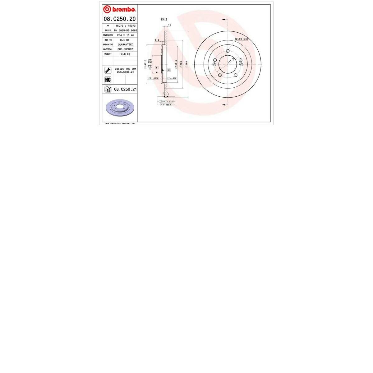 BREMBO 08C25021 Диск торм. зад.[284x10] 5 отв.min2 [замена на ]