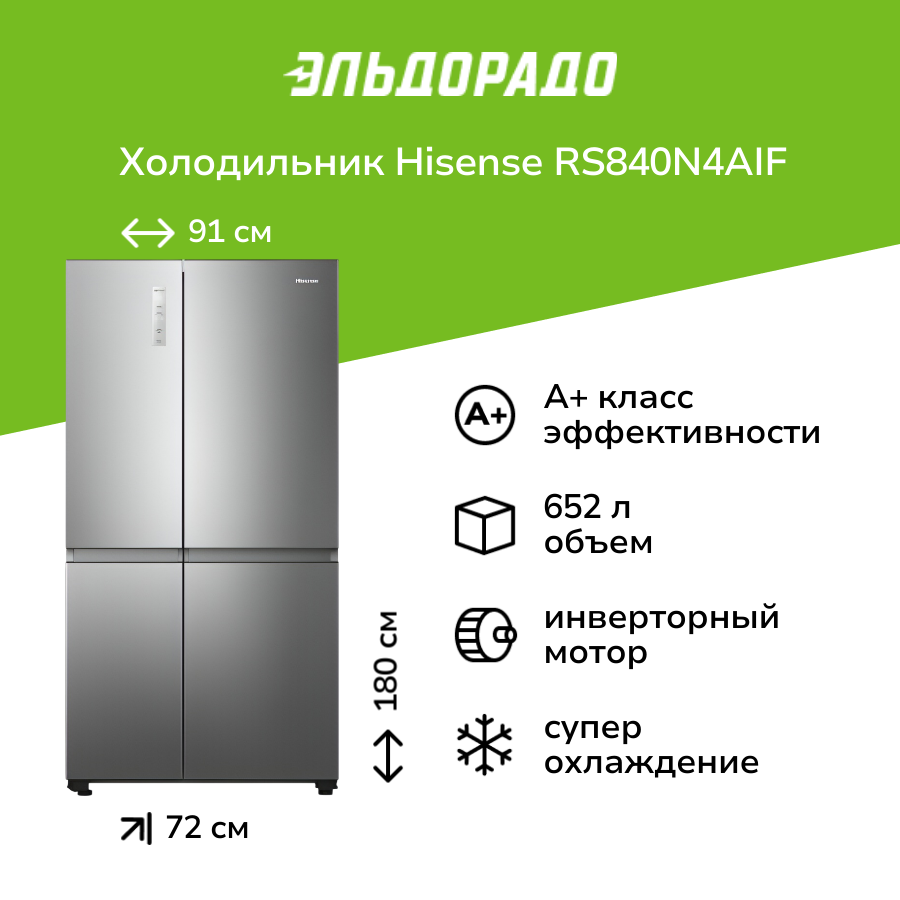 Холодильник Side by Side Hisense RS840N4AIF с функцией Multi Air Flow, общий объем 668 л, ECO режим, управление по Wi-Fi, инверторный компрессор информация: