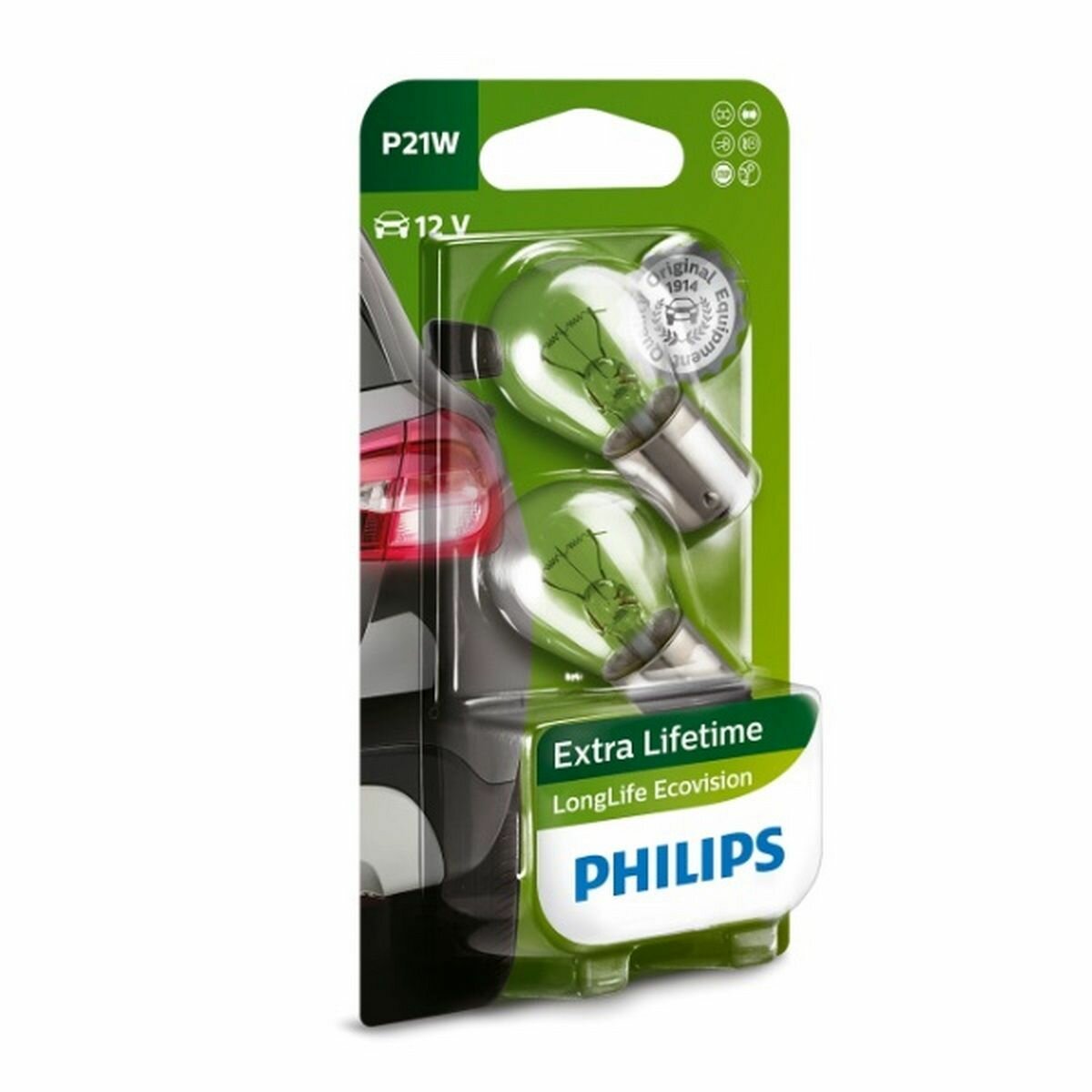 PHILIPS 12498LLECOB2 комплект ламп накаливания блистер 2ШТ P21W 12V 21W BA15S LONGLIFE ECOVISION (4-Х кратный срок службы ПО сравнению со стандартной лампой)