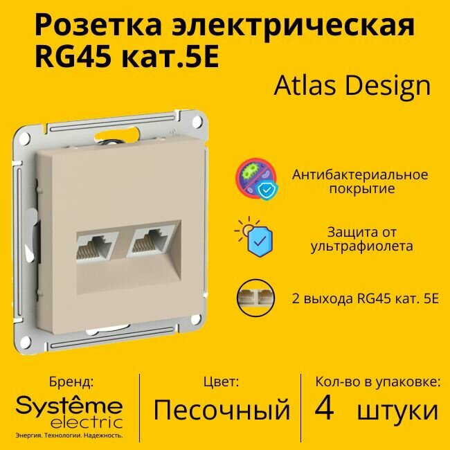 Розетка двухместная компьютерная электрическая Systeme Electric Atlas Design RJ45 кат.5E, Песочный ATN001285 - 4 шт. информация: