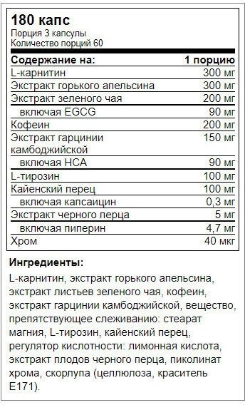 | Дополнительная информация | состав: L-карнитин, экстракт горького апельсина, экстракт листьев зеленого чая, кофеин, экстракт гарцинии камбоджийской, вещество, препятствующее слеживанию: стеарат магния, L-тирозин, кайенский перец, регулятор кислотности: лимонная кислота, экстракт плодов черного перца, пиколинат хрома, скорлупа (целлюлоза, краситель Е171).; рекомендации по применению: Ежедневная доза — 3 капсулы в день. Лучше всего принимать по 1 капсуле перед едой. |
