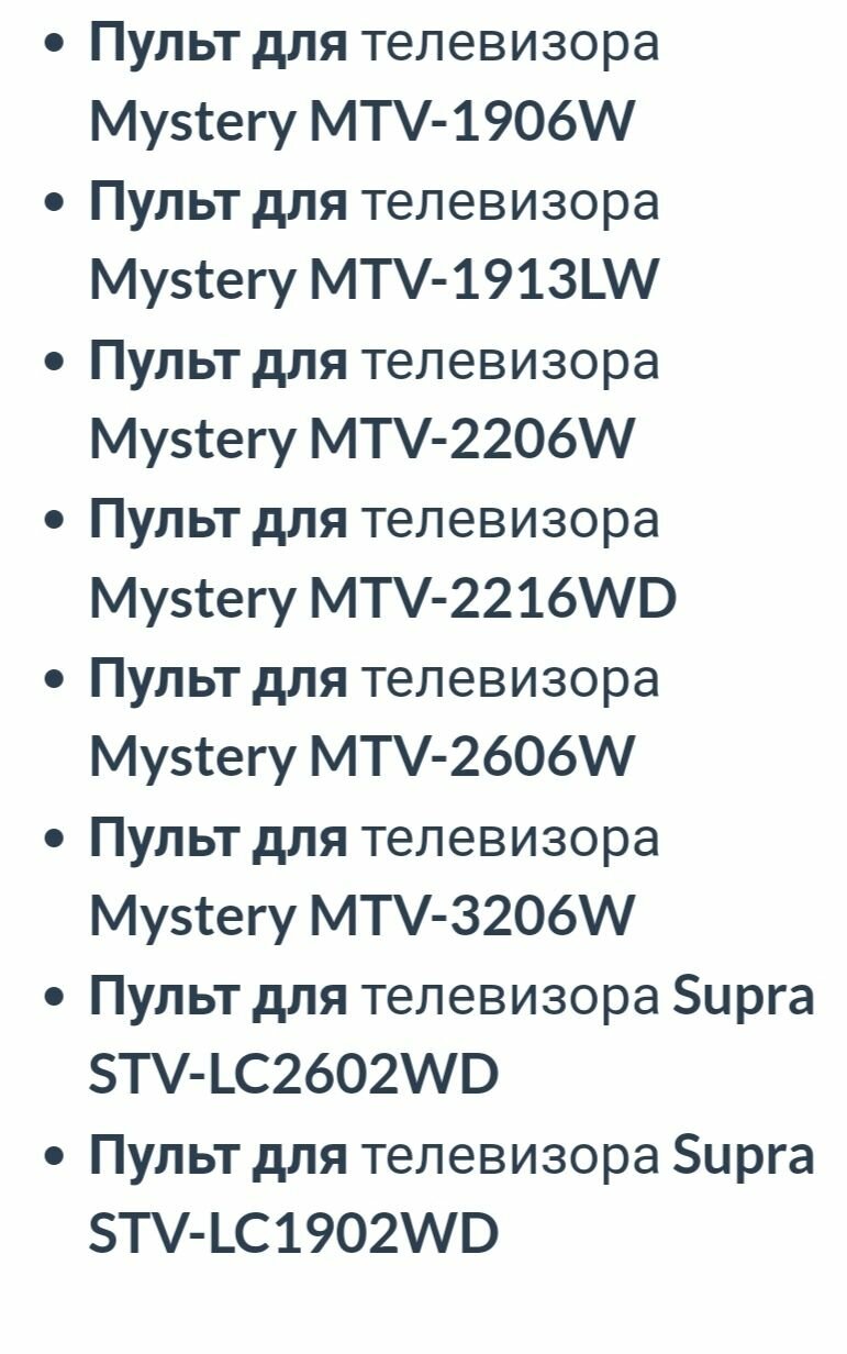 | Дополнительная информация | пульт для телевизора MYSTERY MTV-1906W * пульт для телевизора MYSTERY MTV-1913LW * пульт для телевизора MYSTERY MTV-2206W * пульт для телевизора MYSTERY MTV-2216WD * пульт для телевизора MYSTERY MTV-2606W * пульт для телевизора MYSTERY MTV-3206W * пульт для телевизора SUPRA STV-LC2602WD * пульт для телевизора SUPRA STV-LC1902WD |